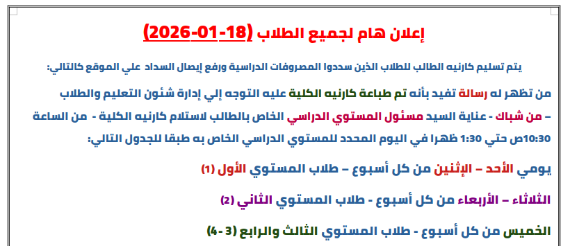 الطالب الذي يرسل صورة ليست بالمواصفات الصالحة لوضعها علي كارنيه الكلية سوف لا يتم طباعة الكارنيه الجامعي له