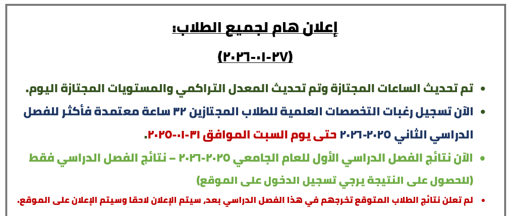 عزيزي الطالب يجب عليك تسجيل الدخول علي صفتك والتأكد من سلامة جدولك الدراسي والضغط علي ذر تأكيد صحة تسجيل جدولك الدراسي